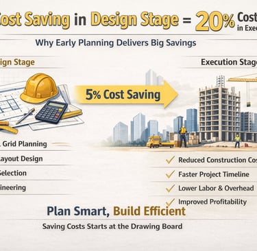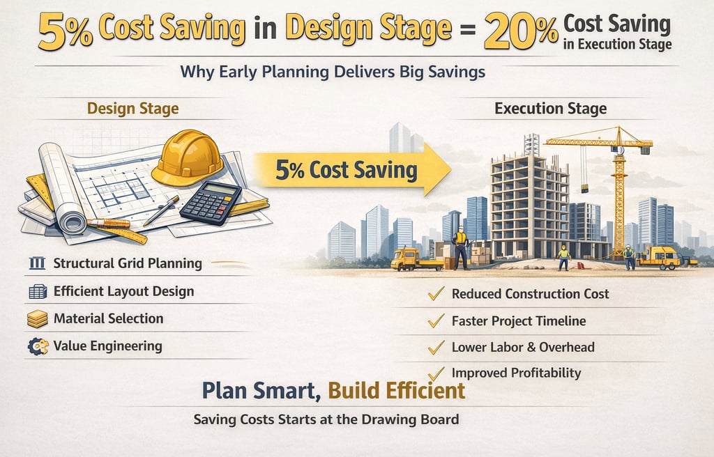 Cost control in construction begins long before execution starts. This article explains how a small 5% cost optimization during the design stage can lead to nearly 20% savings during project execution. It highlights the importance of structural grid planning, efficient layout design, material selection, and value engineering in reducing project costs and execution time. Learn how better planning, simplified designs, and strategic decision-making during the early stages of a project can improve efficiency, reduce construction timelines, and enhance overall profitability for developers.